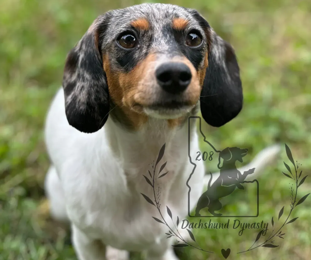 Bella is a feisty girl! she is the alpha in our Dachshund pack and can definitely hold her own, weighing in at only 8 lbs, she means business and ALL of the other dachshunds know it! Bella loves to play, she plays rough and keeps up with the males, often getting zoomies and zooming around the house, she also loves to play with our inside cat. She is the most vocal out of our pack, whether it’s someone knocking at the door, or her begging for food, she’s always making some kind of noise. Aside from being feisty, Bella enjoys belly rubs, sunbathing, and lounging around with her humans, her favorite spot to be when riding in the care is behind your neck, on your shoulders. She has done this ever since she was a puppy and has never outgrown it. Bella is a smart girl and knows many tricks (sit, lay down, paw, spin, bark, stand up) she is a foodie and is highly motivated by food and treats. Bella is what I would describe as a princess, the Queen of the house. She rules with an iron paw! her and our other Dachshund, Hazel, have been best friends since they were puppies, they share the same kennel and are always together. Bella has wonderful confirmation and is a petite miniature dachshund, which is something I personally like in my females dachshunds, I am hoping that she passes along her quirkiness and princess like nature on to her puppies, we need more strong women doxies out there!